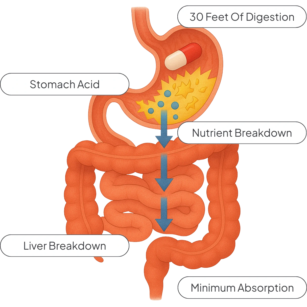 Stomach acid, digestive enzymes, and liver metabolism break down and destroy the active ingredients, in some cases leaving you with less than 20% bioavailability.