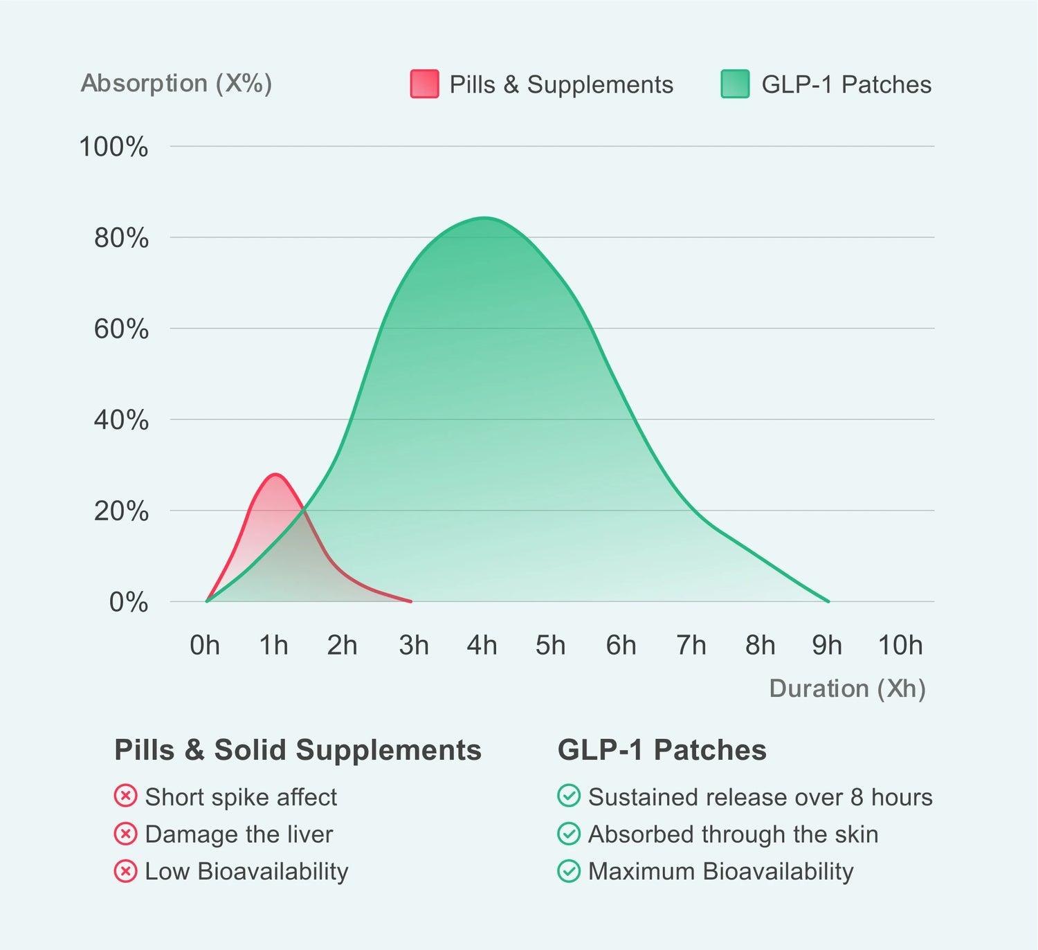 The GLP-1 patch bypasses digestion entirely, delivering a steady dose of clinically tested ingredients through the skin, directly into your bloodstream for up to 5x better absorption.