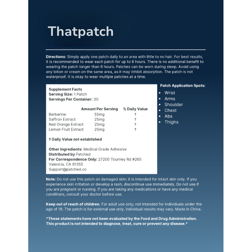 Thatpatch GLP-1 Patch uses natural ingredients that are generally well-tolerated. Some users may experience mild skin irritation at the application site, which typically resolves by rotating application areas. As with any supplement, individual responses may vary. We recommend consulting with your healthcare provider before starting any new supplement regimen, especially if you have underlying health conditions or take medications.*